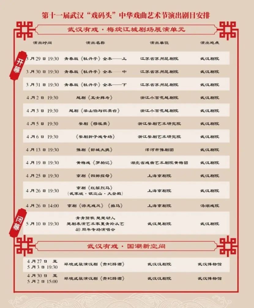 作为开幕大戏的昆曲青春版《牡丹亭》全本将在武汉剧院连演3天。此外还有京剧《红鬃烈马》、越剧《五女拜寿》、婺剧《穆桂英》等常演不衰的经典热门戏曲剧目。张慧芳、俞玖林、蔡浙飞、杨霞云、楼胜等中国戏剧梅花奖得主梅绽江城、共襄盛会,为武汉戏迷带来武汉戏曲“大码头”最强音。