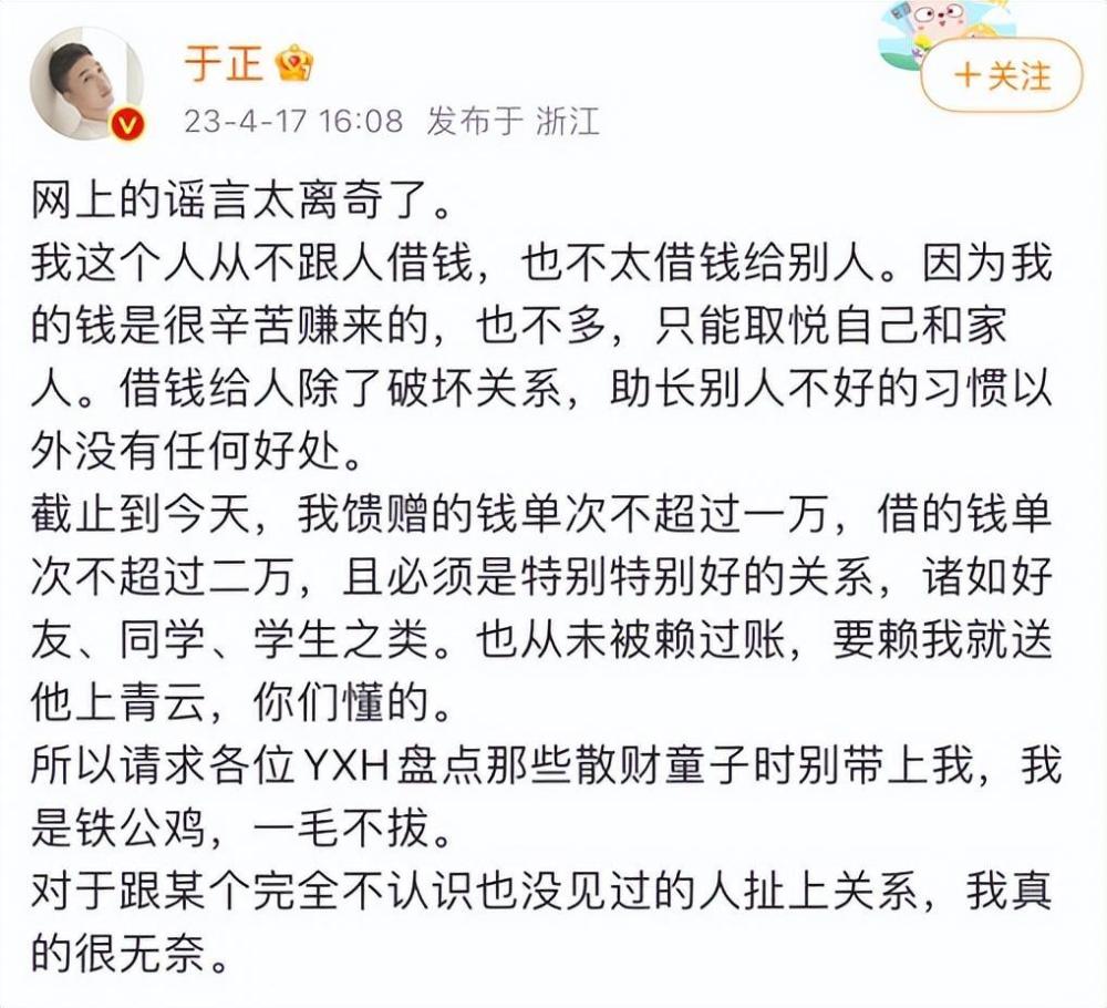 4月17日,著名编剧、导演“于正”发微博回应,“借钱给张继科”的传闻。