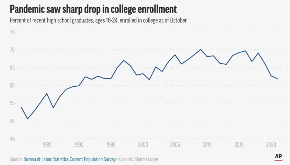 从2019年到2022 年,在全美范围内,大学本科入学率下降了8%。即便恢复线下教学后,入学率也仍在下降。根据美国劳工统计局的数据,从2018年至今的入学率下降,是有史以来最严重的。