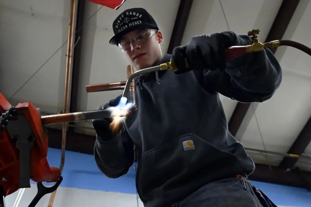 20岁的Williams在学徒培训课程中焊接铜管。图源:美联社