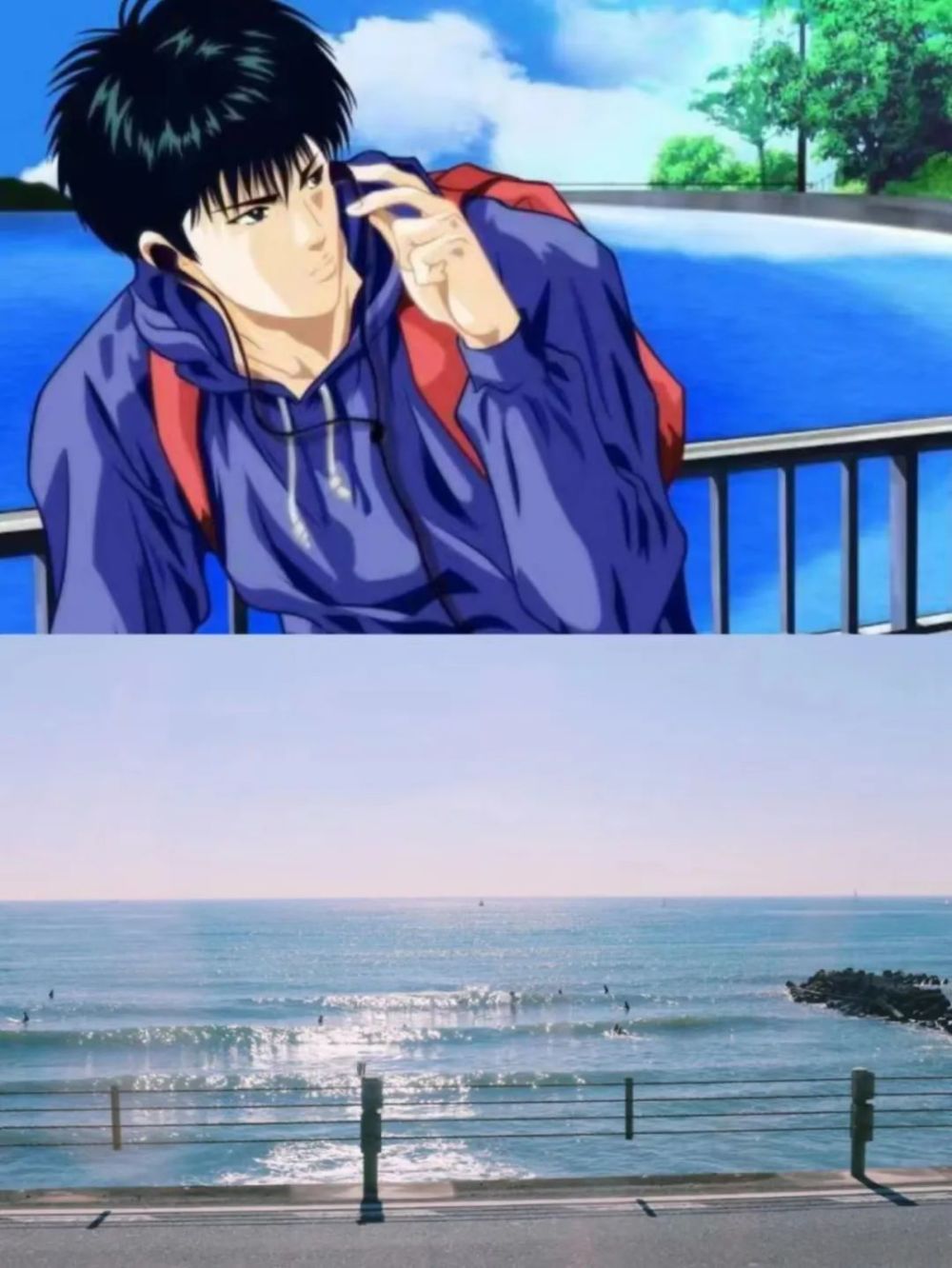 动漫中有一幕是湘北众人前往陵南的路上,空境曾闪过一片晴朗的海滩,远处可眺望江之岛。这片海滩就是七里滨海滩,也是漫画里的湘南海岸。
