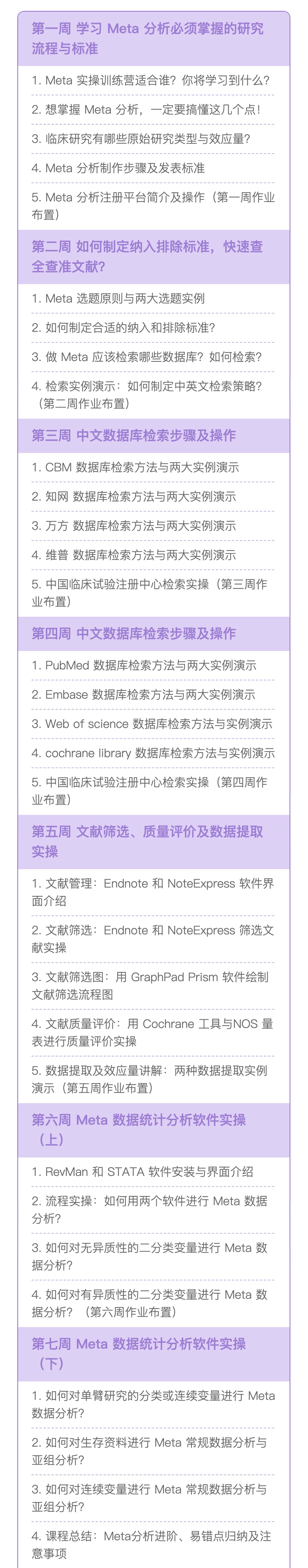 完成所有作业就能模仿一篇 Meta 分析的完整操作,每次作业还原复现一步 Meta 分析流程: