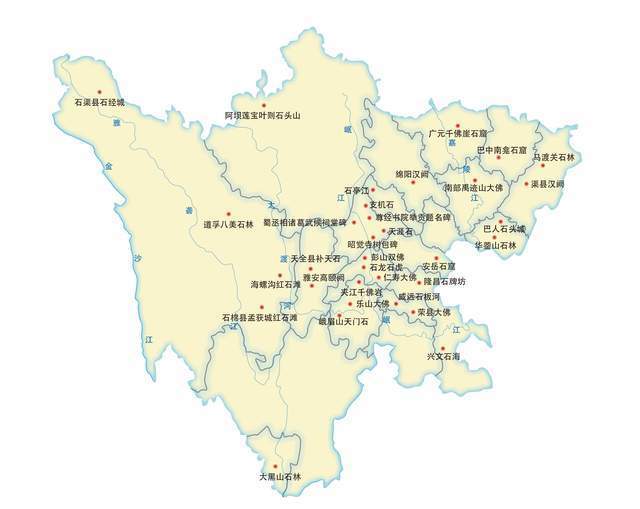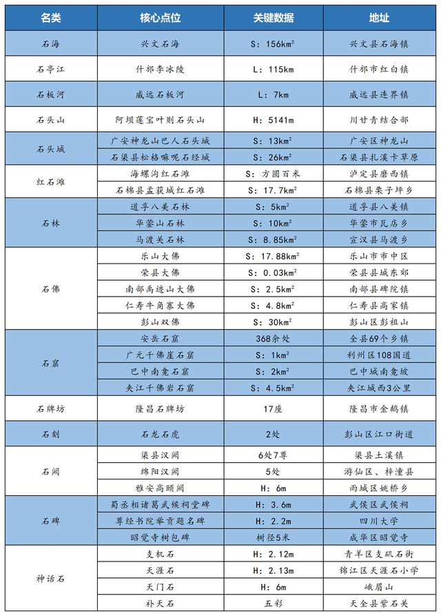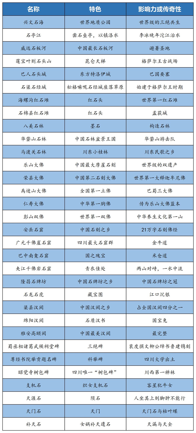 为了系统研究、比较、探源四川石景观的魅力所在,我们按照与石有关(既包括先天的原石、又涵盖后天的石雕石刻石砌)、特色鲜明、且石扮演着主角或相对主角的原则,对四川地图上各种石景观逐一梳理,择其极具代表性者,拉出了一张著名石景观一览表: