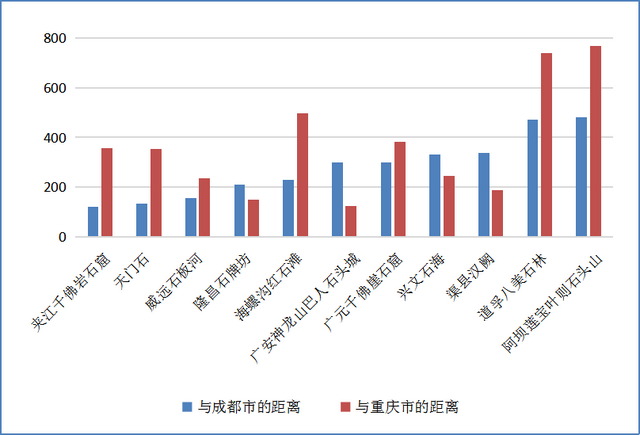 聚集石景观的交通出行半径,我们通过图4可以看到:当距离成渝的两根距离柱基本等高或高差接近时,说明该石景观在交通上具备吸附成渝两个经济圈、两个客源地的双重优势。反之则多为川西高原上的石景观,对中长途的自驾游、包团游、跨省游较为依赖。