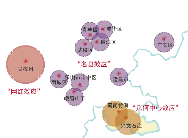 第二组数据是疫情恢复以来第一个黄金期的数据:来自川观的消息,2023春节期间,成渝地区游客前五位的城市分别是重庆、成都、眉山、绵阳、宜宾⑤。透过这两组数据,我们既可以看到高频出现的三座城市成都、绵阳、宜宾——四川GDP“前三甲”,也可以看到实力露脸的乐山、眉山等旅游资源与交通优势“双一流”的城市。