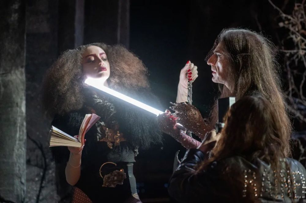 贝特朗:准确地说,它诞生于剧场。我当时围绕这个主题思考了很久,做了大量有关女妖、魔鬼契约的笔记,并伺机将这些聚拢成形。与此同时,菲利普·奎斯纳(Philippe Quesne)正在阿芒迪耶剧院(Théatre des Amandiers)排戏,他建议我搞个与电影有关的演出,我一时兴起,说:“如果我有机会给剧院导场戏,我要叫它‘Conann She Barbarian’!”(Conan the Barbarian指蛮王科南,这里将the换为she)——一语成谶,他觉得这个想法很有趣,便邀请我来剧院工作,我们开始详细规划立项并着手构建故事。在我的印象中,有几场“预演”相当于《科南》的前身,只不过后者多了剪辑和放映。