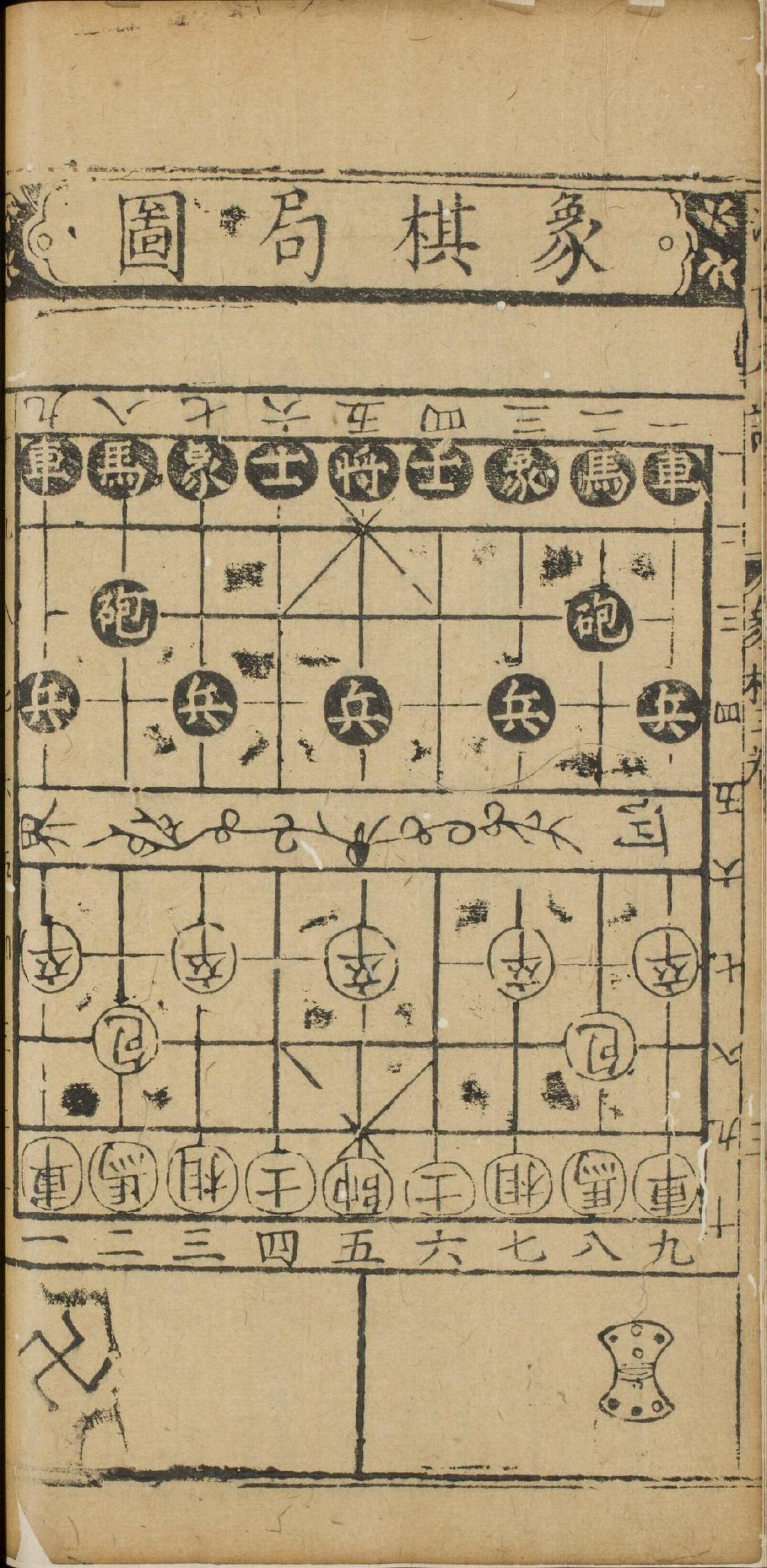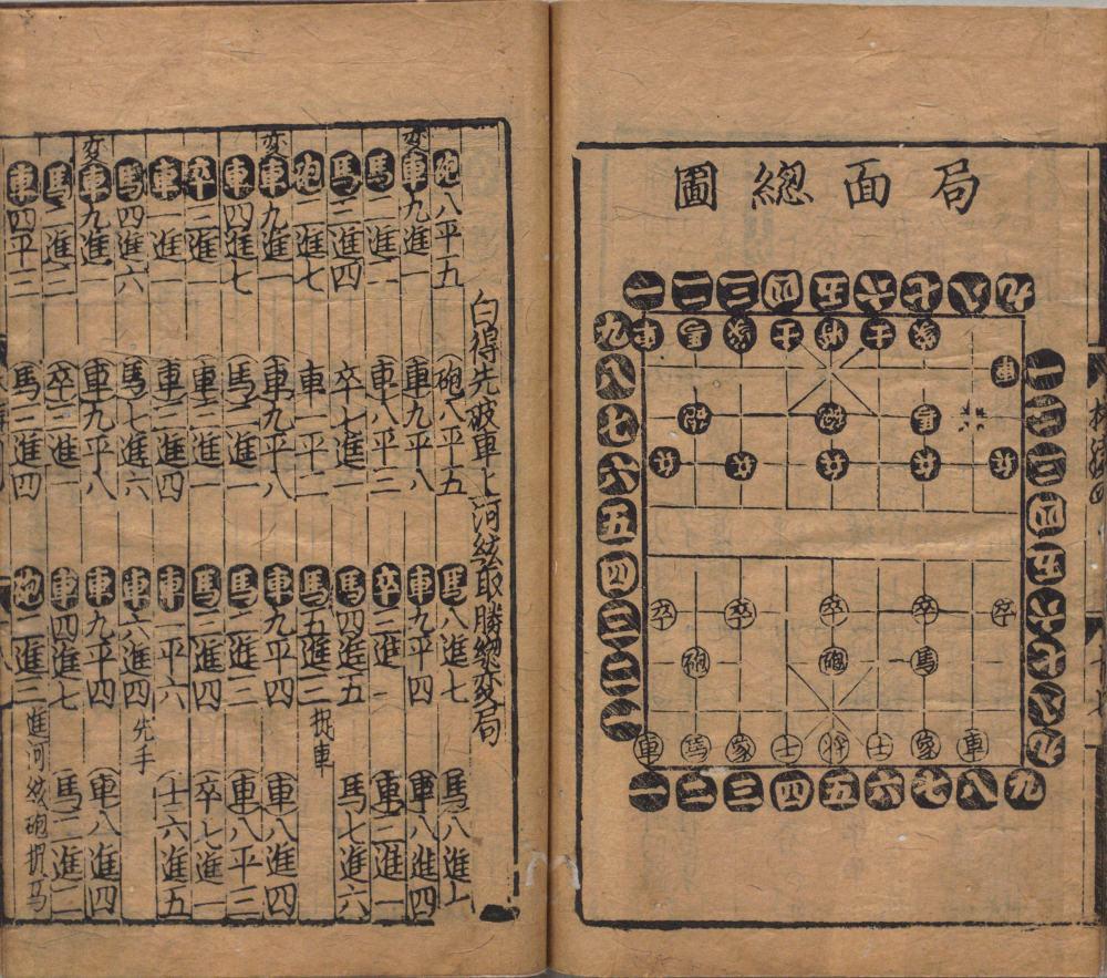 元至顺本《事林广记》文艺类中收录了两个象棋全局和一个象棋残局,该书是现存最早载有象棋内容的书籍。