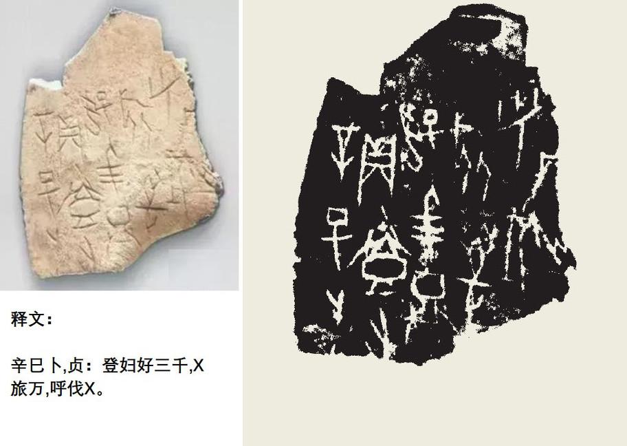 这块商代甲骨虽然小但上面的记载却很惊人:“辛巳卜,贞:登妇好三千,X旅万,呼伐X。” 妇好征召了多达13000人的士兵用于征伐,这也是目前商代征集军队数量最多的纪录,其他还有武丁征伐土方时候一次征集5000人。