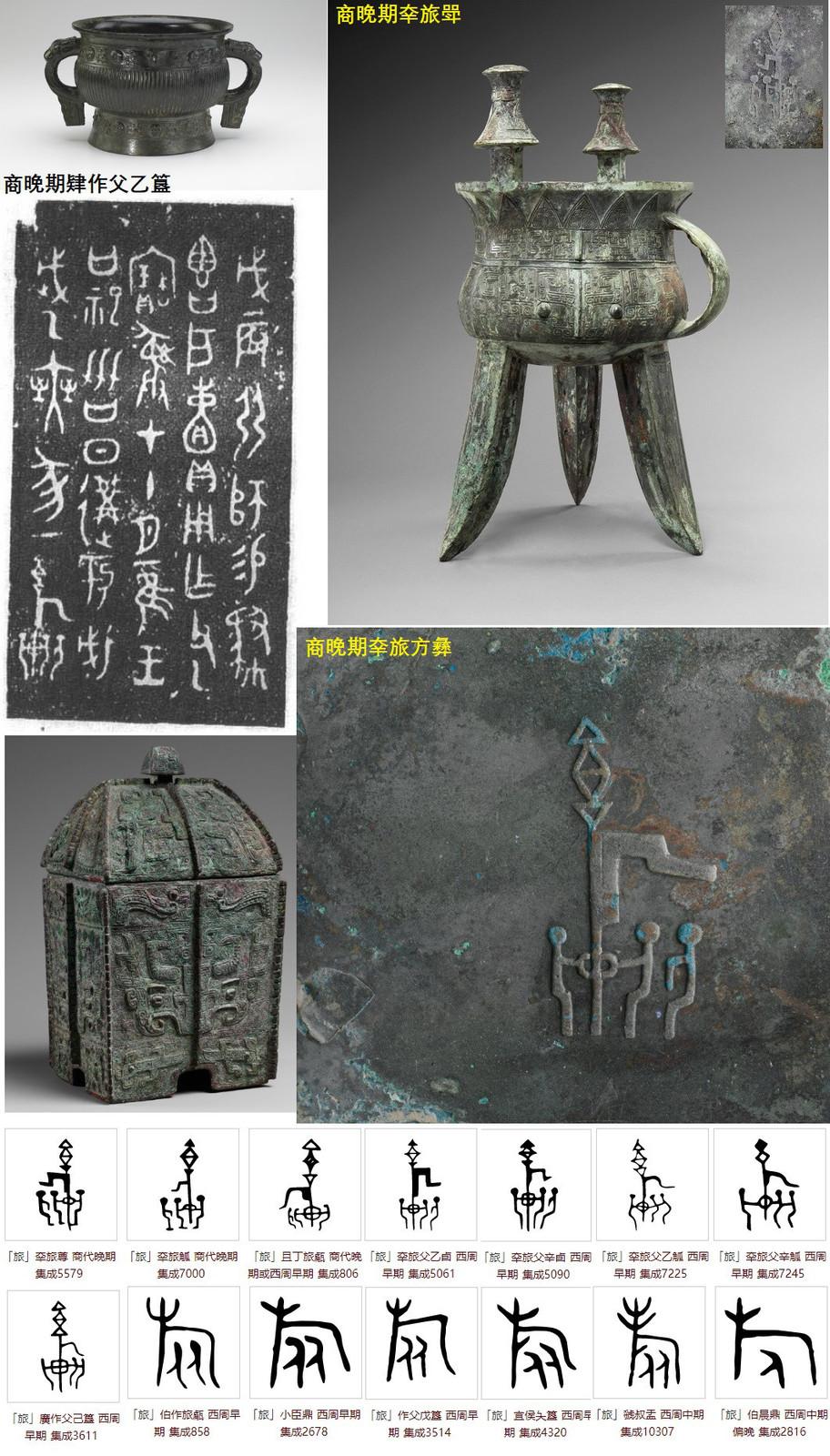 陈梦家先生的《劫掠》一书中曾统计了鼎觯爵卣等六件. 上部是"?", 下部是两人共同扶一个飘扬旗帜的旗杆,旁边还有一人,释为"旅",表示士兵追随于旗帜之下。