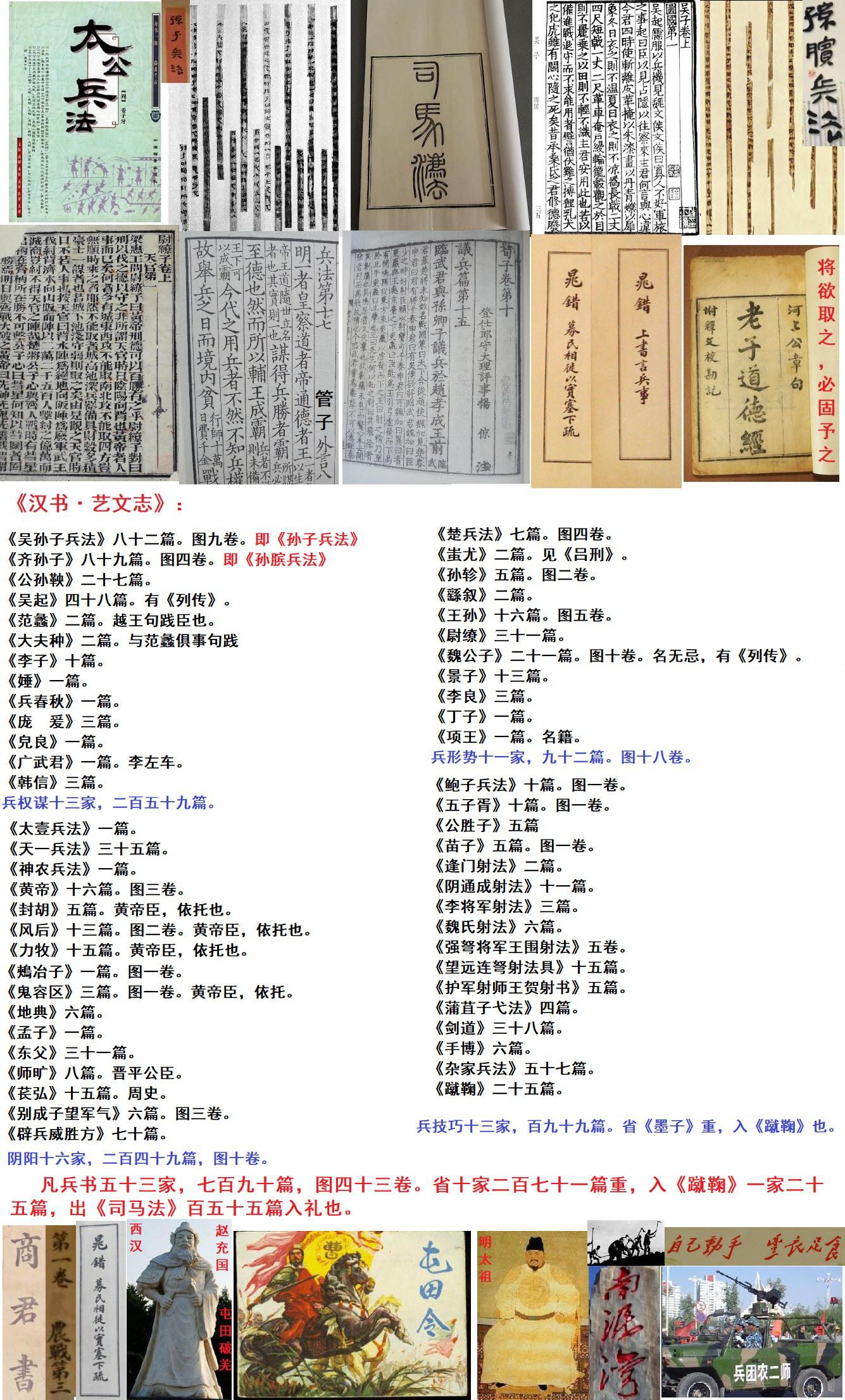 到了商周时期,人们对战争已经十分熟识,有了代表军权的斧钺,调兵的虎符,明尊卑别上下便于指挥的古代“军衔”舆服制,快速传讯的烽燧,指挥的金鼓旗帜,进攻的刀枪剑戟,马车,舟船,防备的甲胄,尽可能多地建造了城池。军事理论也成熟起来了,最早的兵书是文王师姜子牙的《太公兵法》,到春秋晚期的时候,孙子总结了前人的写成了《孙子兵法》,其中的很多观点至今仍是战争的最高指导原则。此后的司马穰苴,孙膑,尉缭子都有著名的兵法传世,到东汉班固总结的时候,论兵著述的有四十余家,专门针对搏击技巧的著述有十三家。除此以外,很多“非军事专家”的先秦诸子乃至两汉大臣在著述中也谈到军事,比如管子,老子,商鞅,荀子,晁错,等等。值得一提的是一个方针政策---“屯田”,最早是西汉的晁错《募民相徙以实塞下疏》中提出来的,但其渊源可以追溯到商鞅《商君书》中的“农战”,西汉的赵充国则在战争中运用它战胜了西羌,后来的曹操统一北方也得力于屯田,明太祖朱元璋则把屯田推广到整个明代的国防军中,建立了以军户为基础的卫所制度,到了近代,八路军的大生产运动乃至于新中国的生产建设兵团其实也都是是屯田制度的延续和发扬光大,其产生的积极效果值得大书图书,是中国人民智慧的结晶。