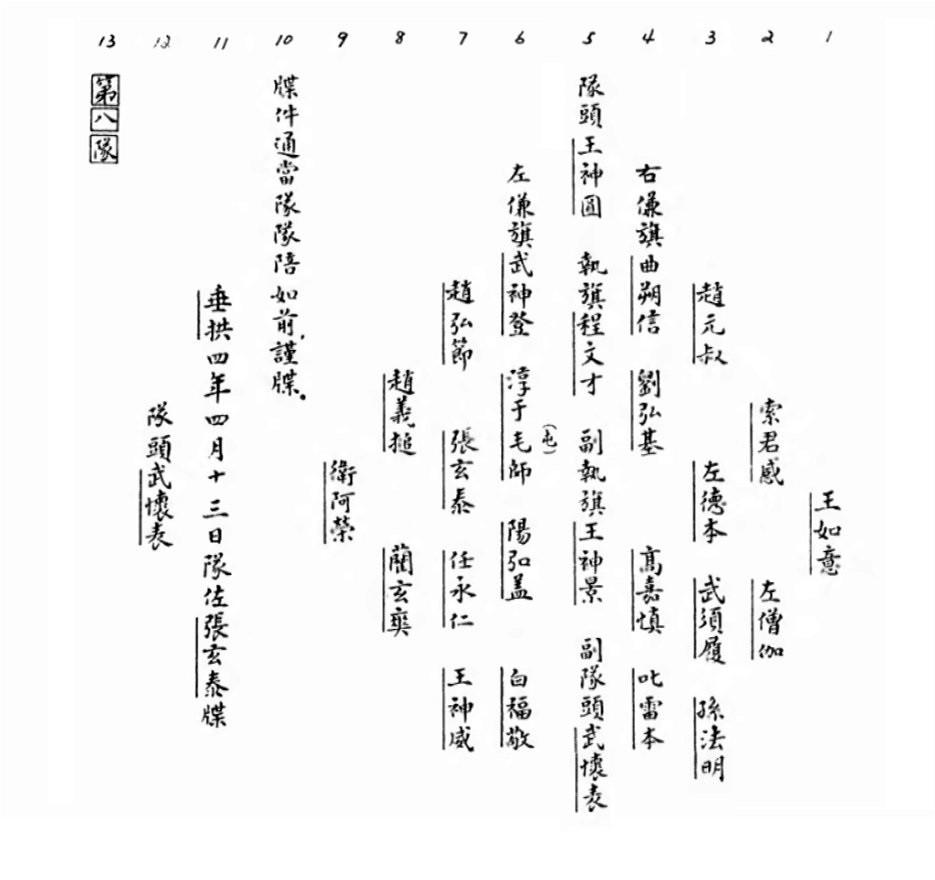 吐鲁番出土唐垂拱四年(688年)文书,记载一个战争中列队的小方阵的阵容,甚至具体到了每个人的名字。(图2为释文)