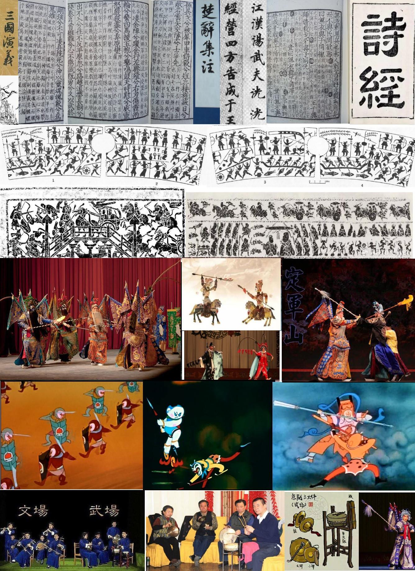 传统戏曲对表现战争也有成熟的理论和实践活动,比如京剧,通过演员的一些专业动作,就可以把战斗的场面在舞台上呈现,用马鞭代表骑马估计是中国创举。(为什么那些据说是最早驯养马匹的地方戏剧极为发达的地方没有做到这一点?)而用音乐表现战斗场面更是一绝,只需锣鼓铙三大件就可以把打斗双方的进攻防御表现得淋漓尽致,让你可以“听”一场战斗。《秦王破阵乐》则是表现战争的著名音乐作品。中国象棋则使普通人在游戏中体验战争:怎样调兵遣将,冲锋陷阵,进攻防守。