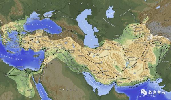 在荡平波斯后,亚历山大率领大军一路向东攻到印度河流域,占领了古印度,自此,世界四大文明古国被其占领了三个,征服面积达500万平方公里,超过同时代我国历史上战国七雄的领土面积总和,到公元前323年为止,亚历山大帝国是当时世界上领土面积最大的国家,亚历山大大帝在其短短13年的征战时间里创下了前无古人的辉煌战绩,他有力地促进了古希腊文化的繁荣和东西方文化的交流,融合了东西文化,对人类社会的进步产生了重大影响。”
