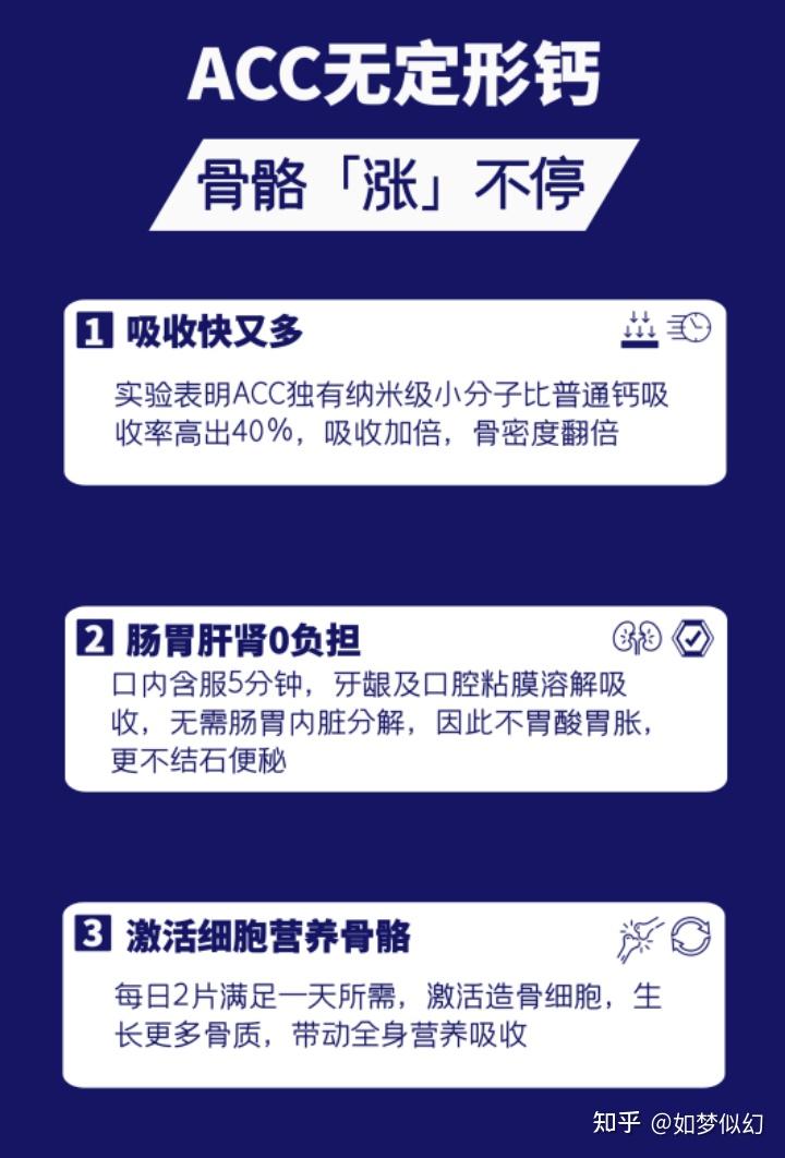 ACC无定形钙独特的含服方法,口腔溶解吸收不会造成内脏(肝胆肾)负担,不伤肠胃不结石不便秘,也无需搭配维生素D使用,适合孕妇/哺乳期女性、中老年人群用于日常补钙。不含糖及任何添加,无副作用。