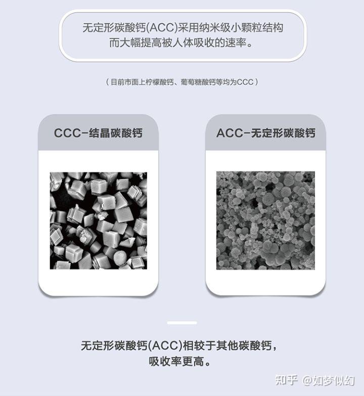 在对15名55-57岁的中老年进行的,旨在比较无定形钙 (ACC) 与传统结晶钙 (CCC) 的生物利用度的比对实验中,科学家得出的结论是:无定型钙(ACC)的吸收效率是传统结晶钙(CCC)的2倍,且副作用更小。