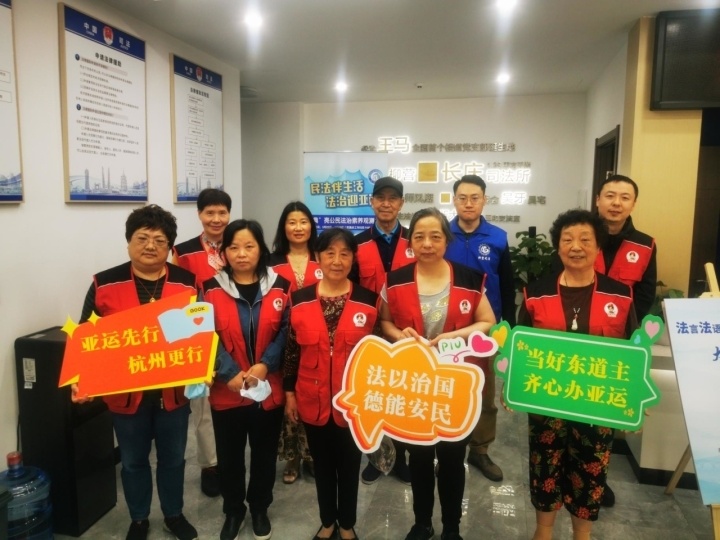 杨映霞也是“武林大妈”秘书长。2022年,武林街道成立“武林大妈”普法学院,不定期进行法治宣传,比如摆摊普法、广场普法——在学雷锋日、三八妇女节等重要的活动节点,发放宣传小册子,做一些普法活动,提高武林群众法律素养。目前,武林街道有3500人实名注册“武林大妈”志愿者,普法的骨干有七八十人。