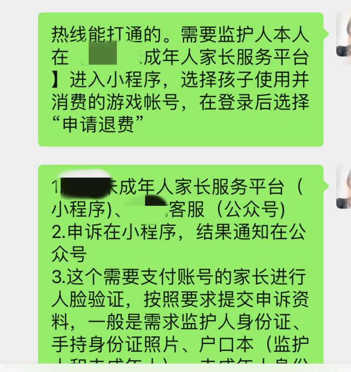 “武林大妈”指导家长向游戏公司讨回充值费用聊天记录截图