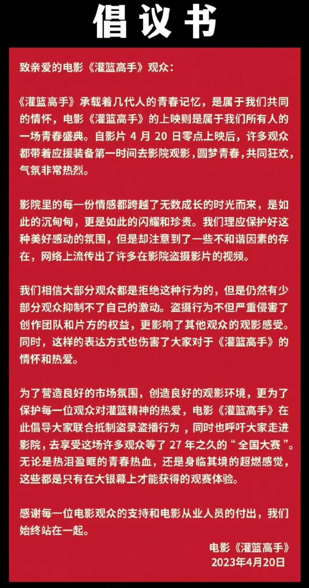 《灌篮高手》的热播,引发了一批中青年的集体怀旧。很多人观影时忍不住掏出手机拍下银幕的某个画面,然后分享“打卡”在社交平台,觉得这是一种“纪念”行为。从人之常情的角度,这种行为或许可以被理解,然而,根据《著作权》等法律的规定,对正在放映的电影进行录音录像,已构成侵权。在这个问题上,情怀的抒发也好,分享的冲动也罢,都应该让位于对法律和电影知识产权的尊重。