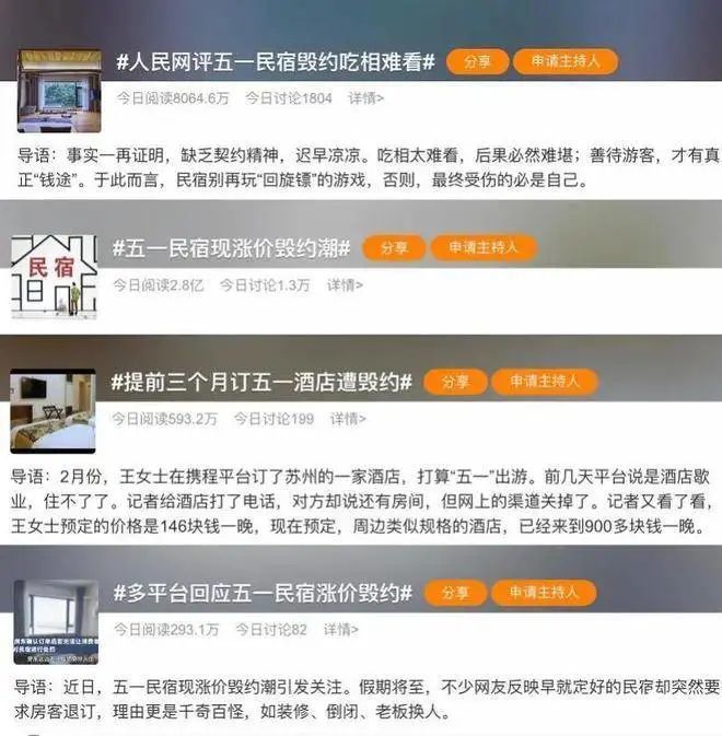 据报道,“五一”假期临近,很多人做好了出行准备,然而不少人却突然被民宿老板要求退订房屋,理由也千奇百怪——“酒店换了老板,在装修”“倒闭破产不干了”,还有的说“五一”期间亲戚朋友从外地回来,所以房子不对外出租了……不少网友在退订后继续寻找房源的过程中,却在其他订房平台上发现了“出幺蛾子”的房子,其价格比原来涨价数百元。