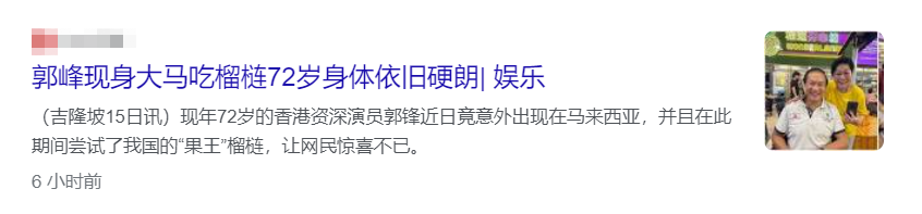 曝光的近照中,郭锋现身马来西亚某餐厅,他穿着白色Polo衫,打扮休闲。不知不觉,他快满72岁了,岁月在他身上留下了不少痕迹,所幸精神状态还不错。