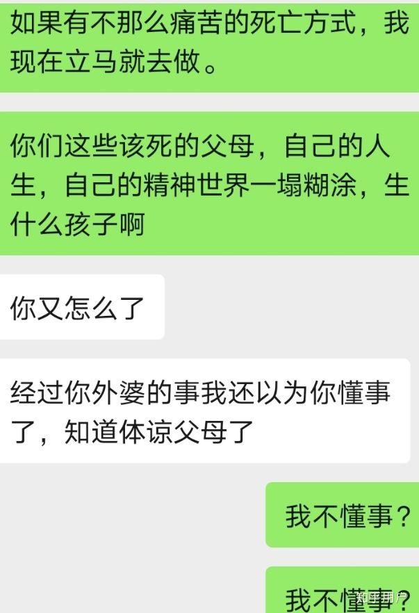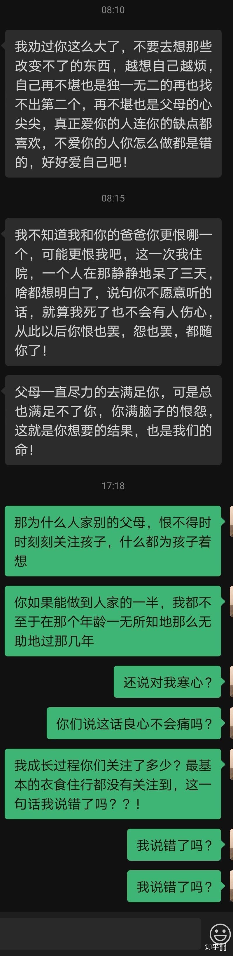 我被自己吓到了,没有人能够想到,我会说图上这些话,没有人能够把这些话代入到我身上,我日常作风很正,有很多同学说过我身上有一种儒雅的感觉。呵呵,没有人能想到,我在家,能够被逼到跪下自残,那么不理智,疯了一样。在家,和父母待在一块,我随时都可能死掉。