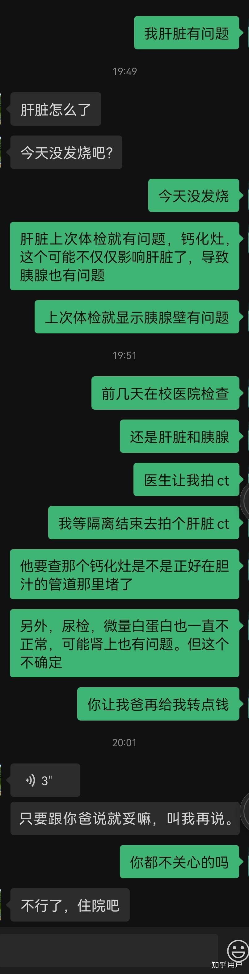 两次彩超都查出来肝脏和胰腺有问题,医生建议我做ct排查一下,我晚上给我妈发了微信,我发了那么多句和病相关的,她只关注到了最后一句让我爸给我转检查费。直接撂了一句 跟我爸说呗跟她说干啥。