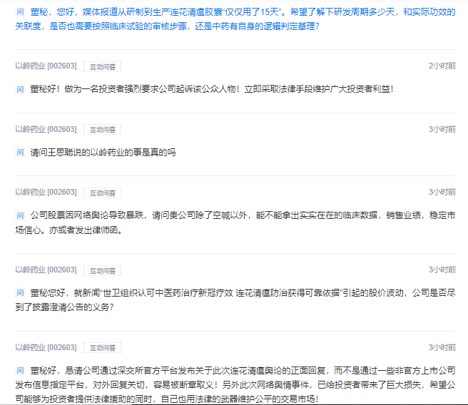 4月18日,时间财经留意到已有不少投资者在深交所互动易平台上就此事发声,并要求以岭药业针对“此次连花清瘟舆论”给予正面回复。