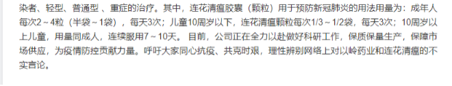 4月15日,以岭药业在互动易平台上回复的长文中表示,连花清瘟预防新冠肺炎研究已经发表。此外,以岭药业还给出了连花清瘟胶囊(颗粒)用于预防新冠肺炎的用法用量。
