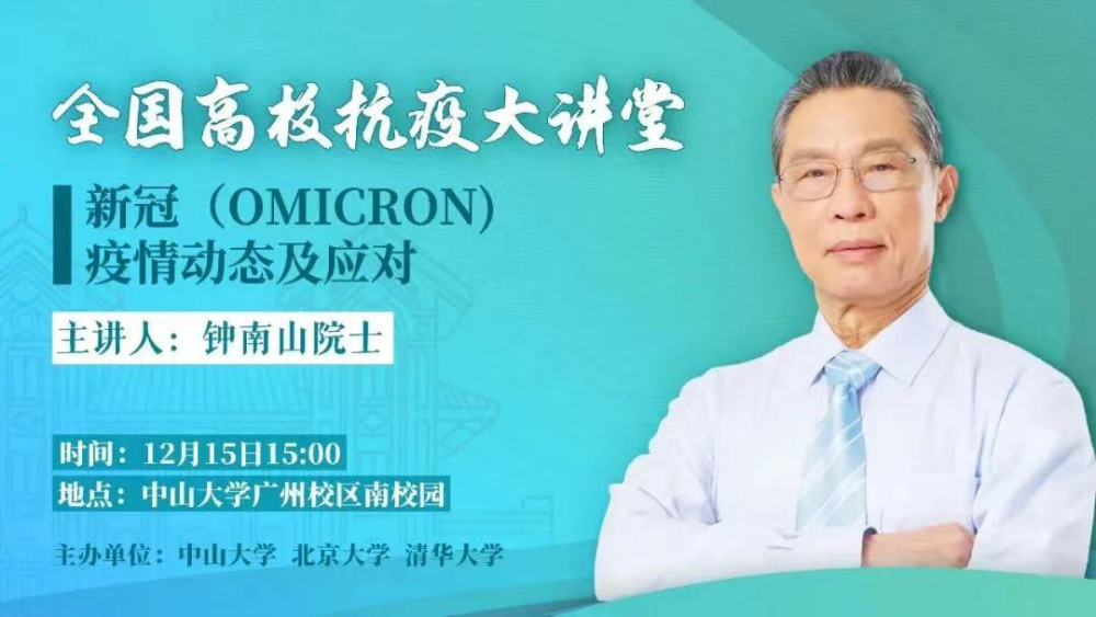 今天下午15:00,钟南山院士全国高校抗疫大讲堂开讲,点击图片预约直播,了解最新新冠(OMICRON)疫情动态及应对。