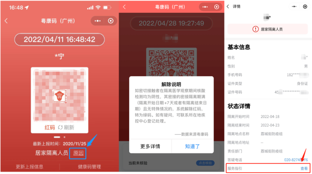 请按下方“操作图示”点击粤康码(广州)下面的“原因”或“详情”,然后再点击页面内的“服务指引”,按“解除说明”或“服务指引”操作,同时向所在地的社区报备。