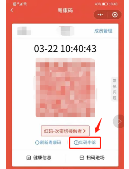 粤省事小程序粤康码红码人员,对红码问题有异议的,请点击粤康码页面“红码申诉”(如下图)进行反映。