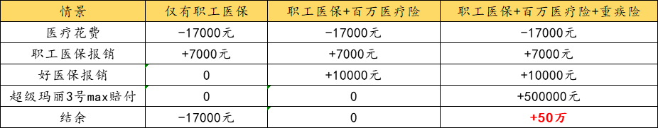 假设当时这位女士购买了支付宝好医保长期医疗险、超级玛丽3号max重疾险(保额50万),分3种情况: