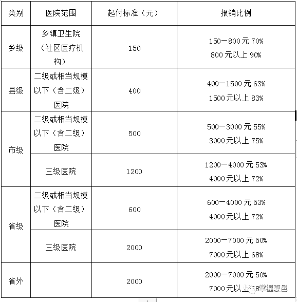 报销费用为政策范围内住院合理费用,起付线和报销比例按照医院级别和合理费用分段: