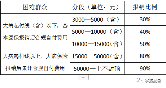 困难群众发生的住院医疗费用(含规定的门诊慢性病、重特大疾病限价(额)结算的医疗费用),经基本医疗保险报销后,个人累计负担的合规自付医疗费用在大病保险起付线以内(含)的部分,直接进入大病补充保险分段按比例报销;超过大病保险起付线的部分,首先由大病保险报销,剩余部分由大病补充保险按政策报销。合规自付医疗费用与城乡居民大病保险范围一致。全省各级定点医疗机构均已实现城乡居民基本医疗保险、大病保险、困难群众大病补充医疗保险的“一站式”即时结算。报销比例: