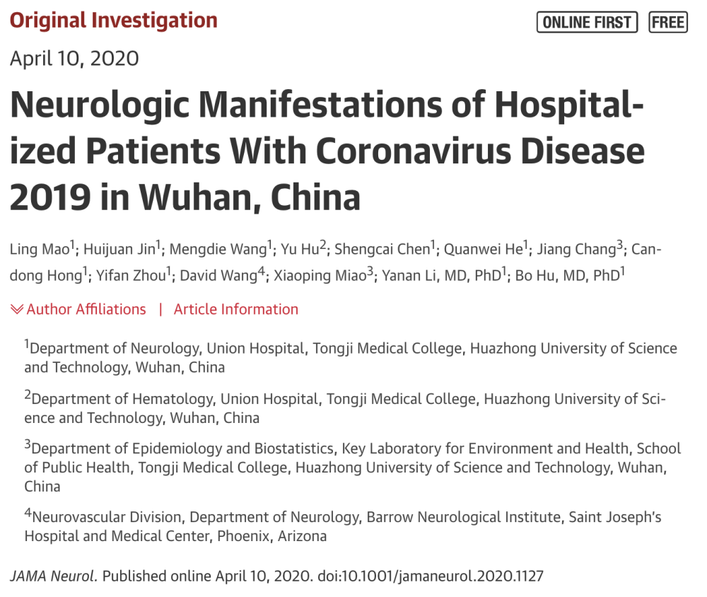 SARS-CoV、MERS-CoV等其他呼吸道病毒入侵神经系统的案例并不罕见,那新冠病毒对患者神经系统又有怎么样的影响?当地时间4月10日,华中科技大学同济医学院联合美国圣约瑟夫医院的研究团队在顶级期刊《美国医学会杂志》(JAMA)在线发表了一篇文章“Neurologic Manifestations of Hospitalized Patients With Coronavirus Disease 2019 in Wuhan, China”。