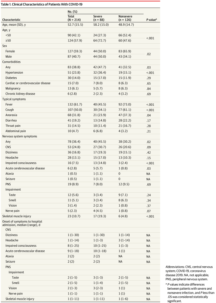 这是一项回顾性病例观察研究,数据收集时间从2020年1月16日至2020年2月19日,患者来自华中科技大学同济医学院附属协和医院的主区、西院、肿瘤中心。研究纳入了214名经实验室确诊为新冠病毒感染的住院患者。患者临床资料从电子病历中提取,所有神经症状资料由2名专业的神经科医生筛查。