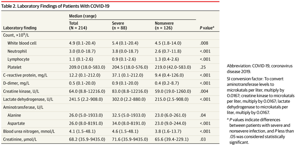 214例患者中,88例患者(41.1%)为严重患者,126例患者(58.9%)为非严重患者。其中严重患者年龄明显偏大(平均年龄,58.2岁vs 48.9岁;),也更有可能患有其他基础疾病(42 [47.7%]vs 41 [32.5%]),尤其是高血压(32例(36.4%)vs 19例(15.1%))。