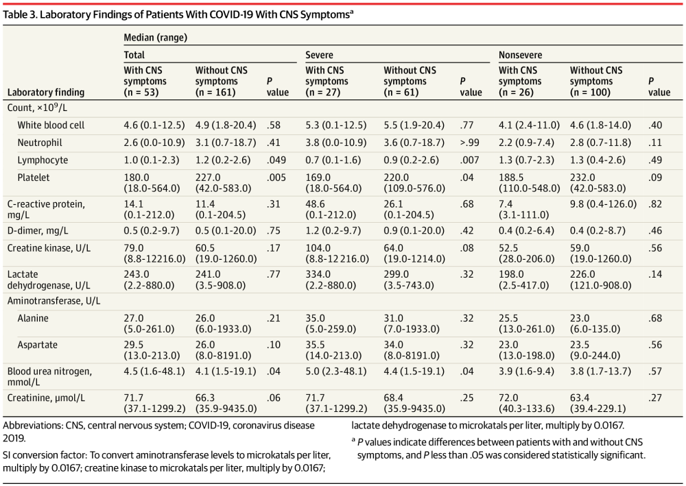 研究团队发现,与无中枢神经系统症状的患者相比,有中枢神经系统症状的患者淋巴细胞水平、血小板计数较低,血尿素氮水平较高。在严重组中,结果类似;但在非严重组中,有无中枢神经系统症状的患者的实验室检查结果没有表现出显著差异。