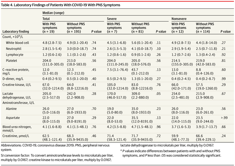 另外,研究团队发现,外周神经症状患者与无外周神经症状患者的实验室检查结果没有显著差异。严重组和非严重组中均得出相似结论。