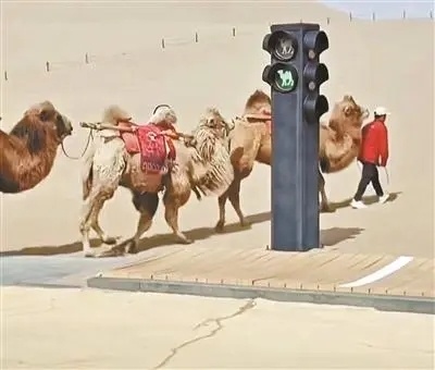 为此,敦煌市鸣沙山月牙泉景区在步道和驼道交叉的路口,专门设置了骆驼专属的红绿灯,引导人流、车流、驼队流有序交叉通行,使骆驼通行效率大大提高。同时,5月1日起,景区在原有两条下山路线的基础上又增开了一条下山路线,使景区堵骆驼的情况得到了有效缓解。