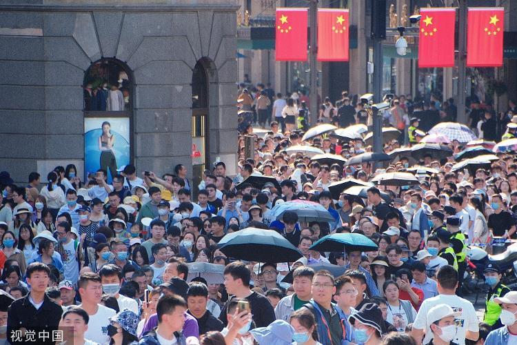 2023年5月1日,上海南京路步行街及通往外滩的路口人山人海。