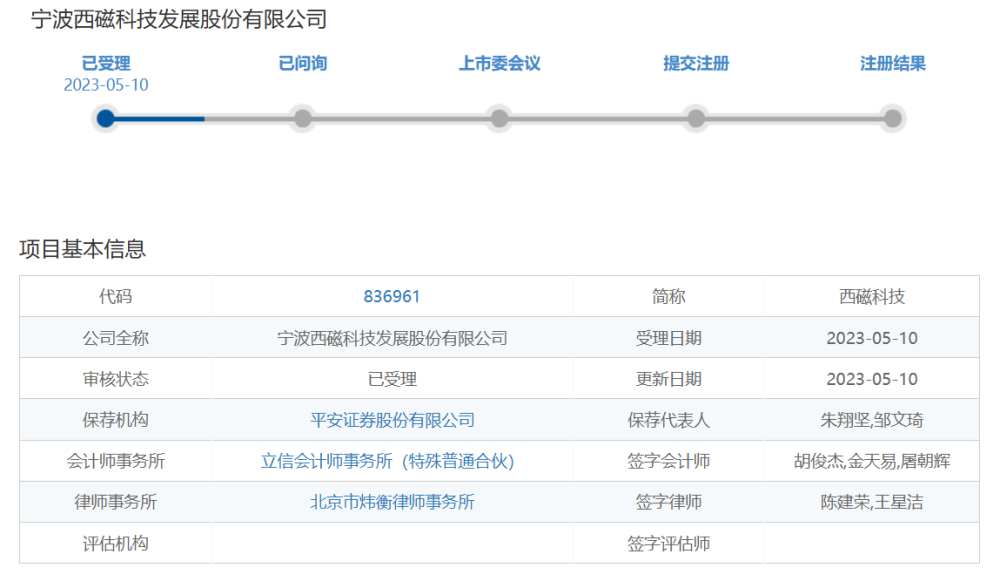 北交所官网消息显示,2023年5月10日,宁波西磁科技发展股份有限公司(简称“西磁科技”)IPO获受理,此次发行上市保荐机构是平安证券股份有限公司。
