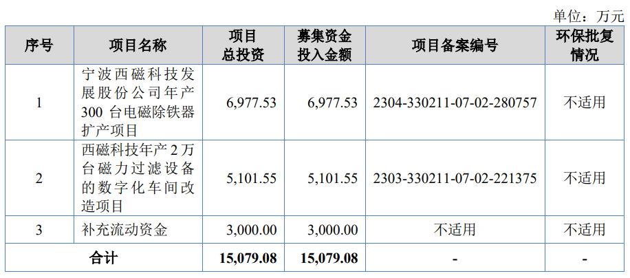 本次公开发行新股的募集资金扣除发行费用后,拟投资于宁波西磁科技发展股份公司年产300台电磁除铁器扩产项目、西磁科技年产2万台磁力过滤设备的数字化车间改造项目、补充流动资金。