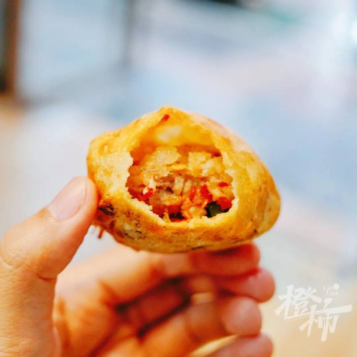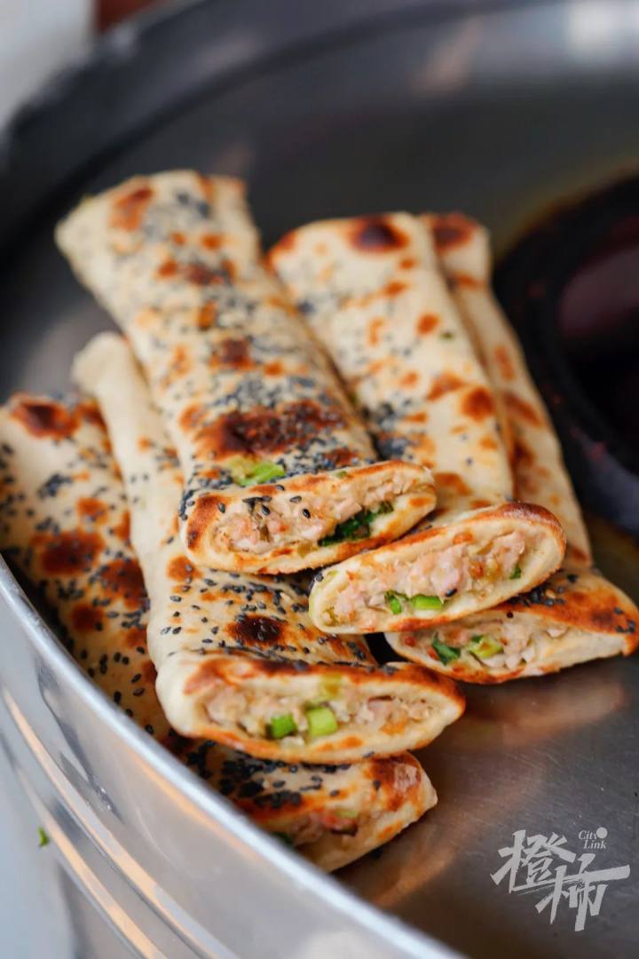 烧饼里面有肉、小葱、豆腐……有辣和不辣两种口味可选,辣的看起来更受欢迎。我点的是辣口味的搁袋饼,刚做好时焦香味特别浓,辣味不那么明显,但是很快后劲就上来了,我的嘴唇开始发烫发红,绷不住赶紧灌了一瓶冰可乐才缓解下来,衢州的辣,果然还是不能小瞧啊!