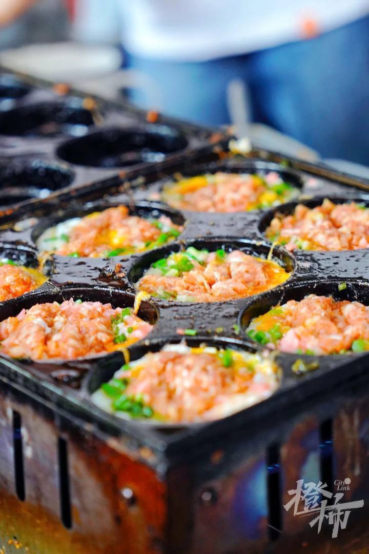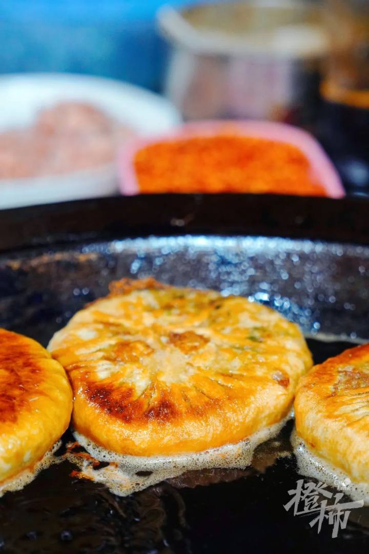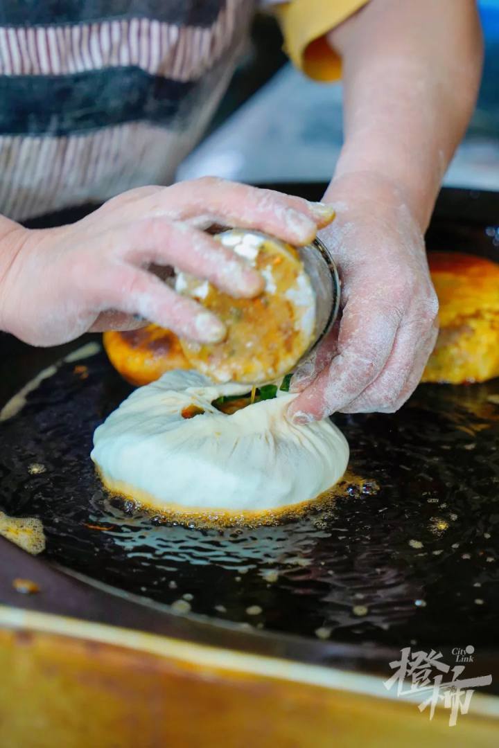 鸡蛋馃类似油煎的馅饼,馅料里是大量的葱末和肉末,放入热油里煎的同时从包子褶口部倒入鸡蛋液调成的酱汁,封口后翻转再继续煎就成了鸡蛋馃。老板老阮不断地把热油舀起淋在鸡蛋馃上,“这样受热更均匀,熟得快。”看我忙着拍照,他还温柔提醒:“快点吃,冷掉了。”