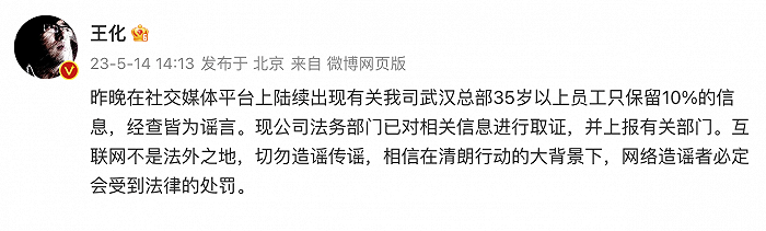 【小米辟谣武汉总部35岁以上员工只保留10%】 5月14日,小米集团公关部总经理王化发布声明称,“昨晚在社交媒体平台上陆续出现有关我司武汉总部35岁以上员工只保留10%的信息,经查皆为谣言。现公司法务部门已对相关信息进行取证,并上报有关部门。”