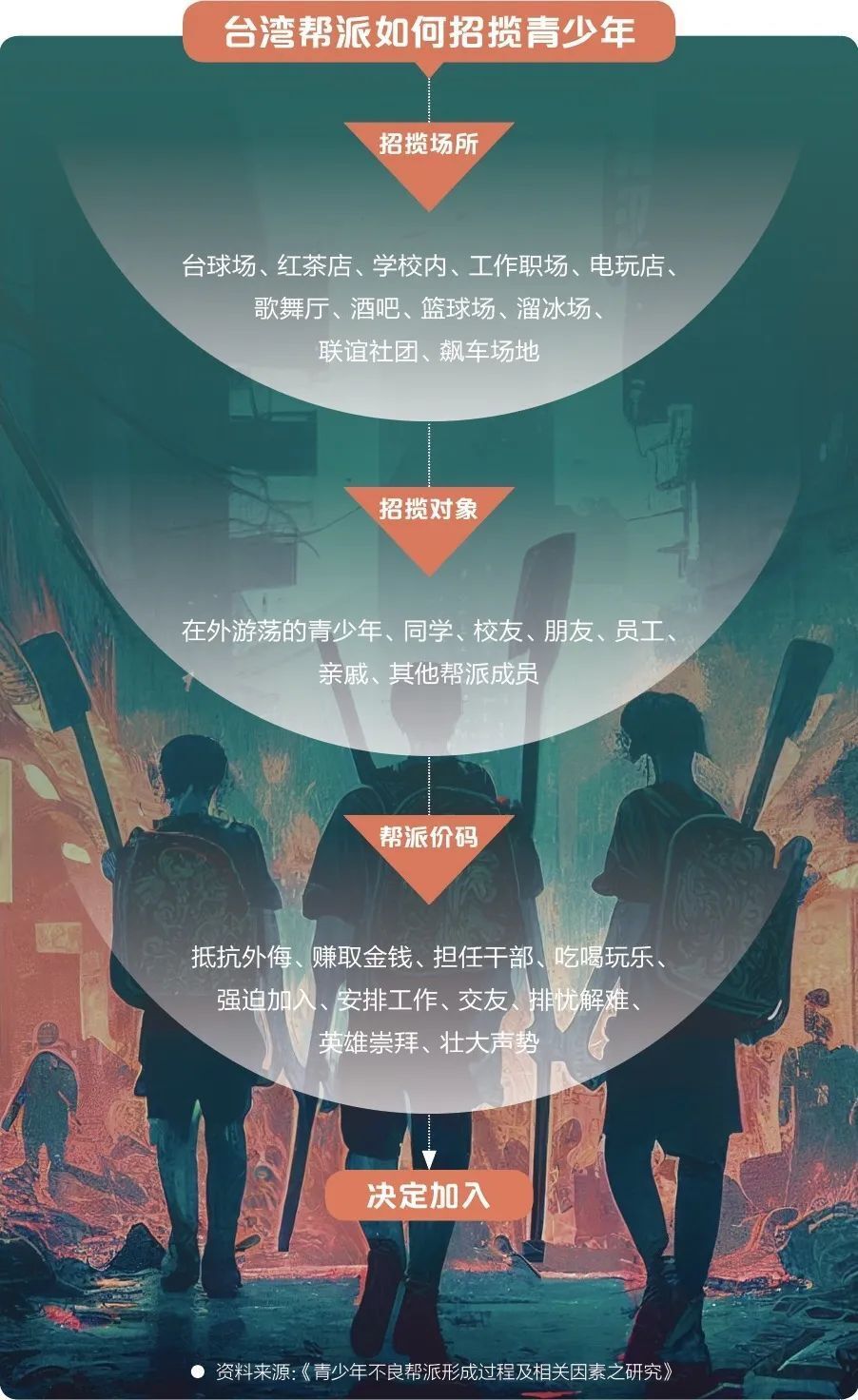 帮派广泛招募“愣头青”有很多考量。台湾学者曾撰文分析,通常黑社会性质的帮派以企业、会馆的方式存在,它们经营特殊行业,比如催讨债务、勒索财物等。非法营利需要人手,只需略施小利甚至提供免费玩乐,就能笼络人心。这些学生娃血气方刚,正是喜欢拉帮结派的年龄,他们便宜又好用,又因年龄小能逃避刑罚,帮派何乐而不为?