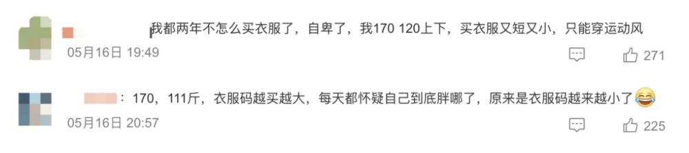 她们的身材体重没有变动,衣服的尺码却越穿越大,从M到L再到XL的递增不只是字母的变化,更像一道天外之音,无情宣判她们“变胖”了。