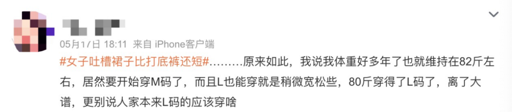 5月17日,#女子吐槽裙子比打底裤还短#登上微博热搜,有网友吐槽“现在的裙子短到一弯腰就漏屁股,还长得跟童装一样”,还有网友称自己体重常年维持82斤,现在都能穿L码。