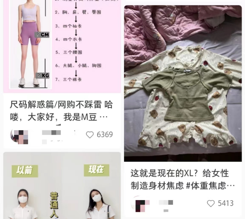 而近几年流行的BM风、少女风穿搭就是白幼瘦审美的典型案例,这样的服装风格也加剧了许多女性的身材焦虑。“显瘦”成为女装畅销的标签,消费者对购衣尺码变大的不满,潜意识里或多或少也是受到了S和M码代表瘦和美的观念影响。
